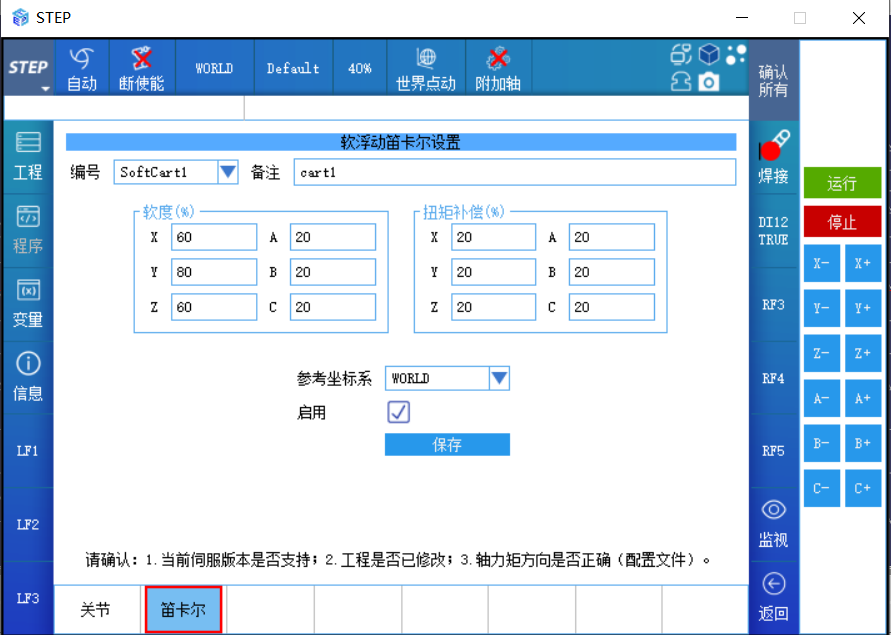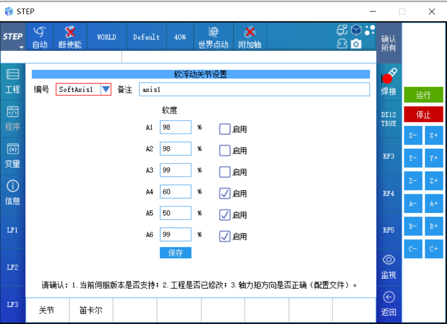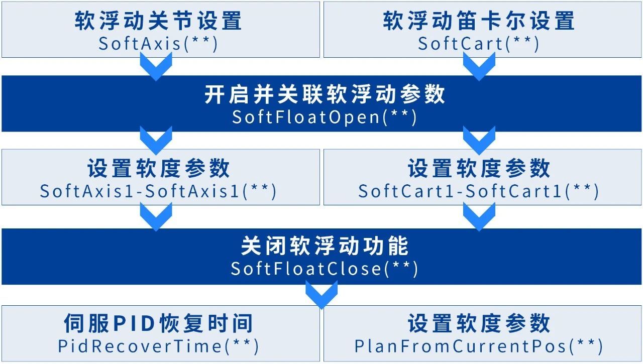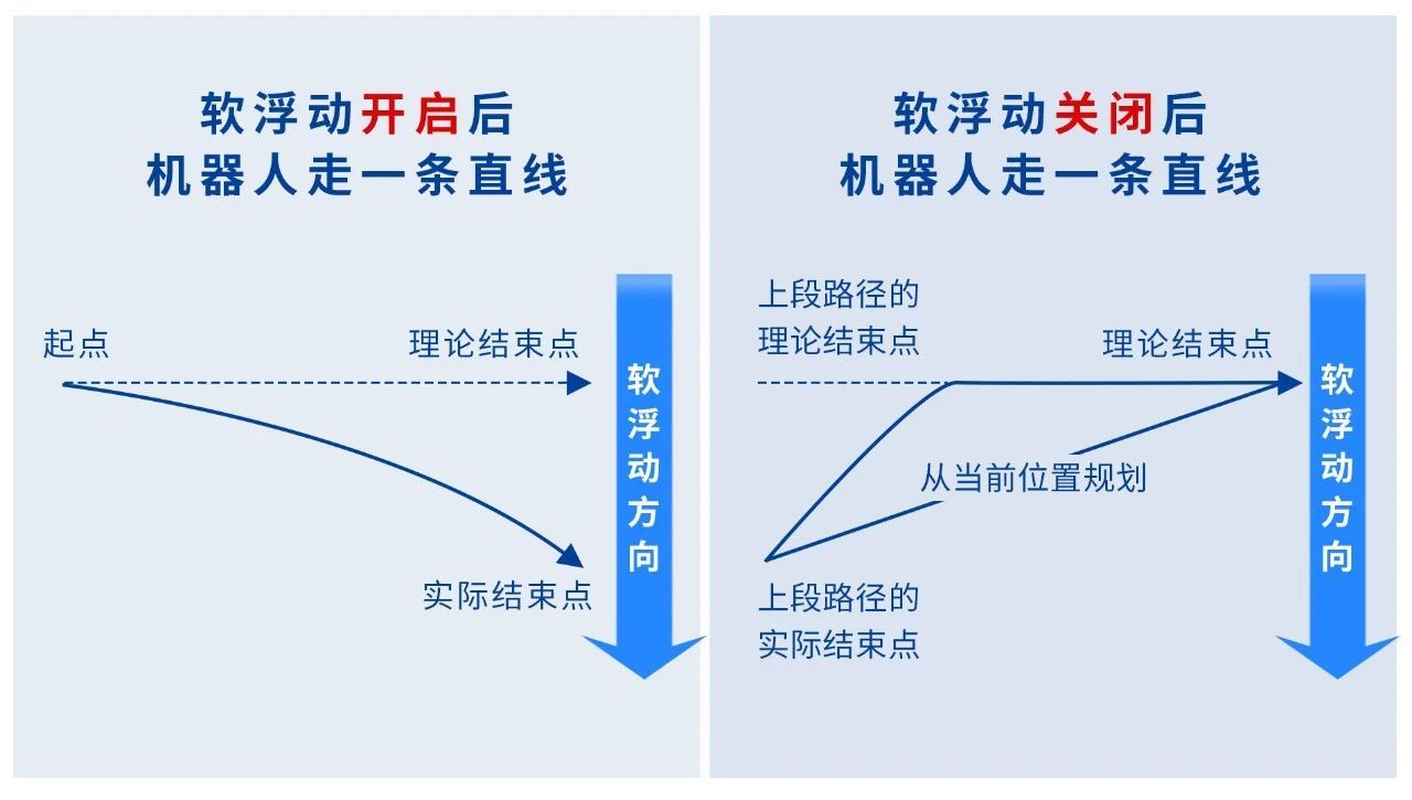 用于机器人在外部力作用下,沿着指定的矢量方向移动;软浮动功能正常关闭时,伺服在设置时间内慢慢回到开启软伺服功能前的状态(PID参数逐渐增大),关节位置跟踪到下发的位置。