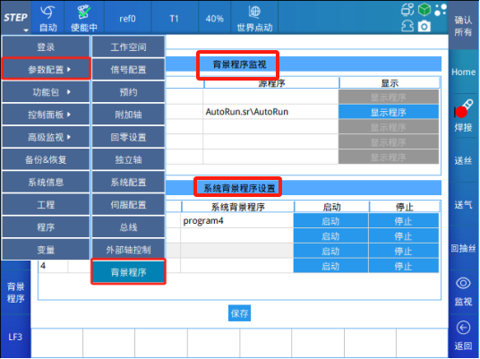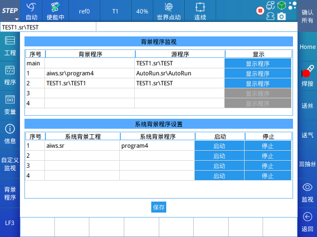 (1) 系统背景程序配置系统背景程序最多可以配置四个(对应线程ID 1-4),选择对应的工程和程序,相互路径不可重复,点击保存完成配置;