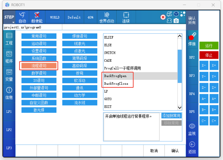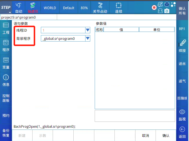 其中线程ID的值为1、2、3、4中的一个值,即同时最多只能开启4个普通背景程序;普通背景程序的选项类似于子程序调用,可以选择全局工程下的程序名称和同工程下的其他程序名称。