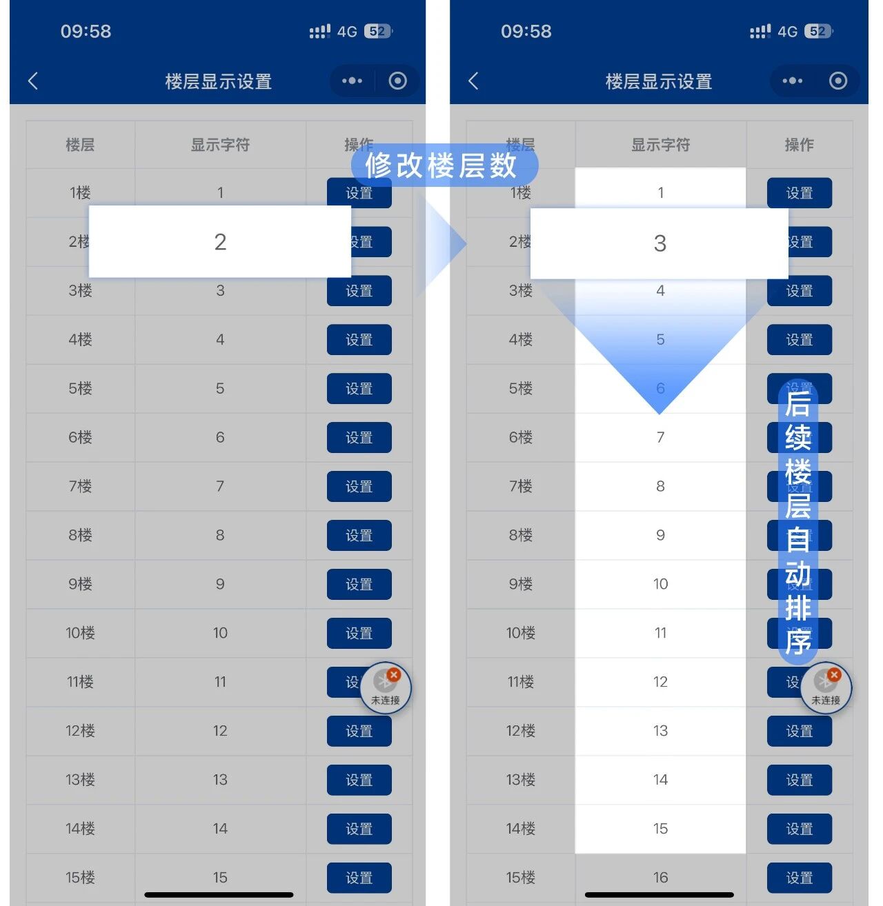 在智能调试下,楼层设置变得简单又快速。修改任意楼层显示,系统即按新顺序自动重排后续楼层,无需手动逐层调整。