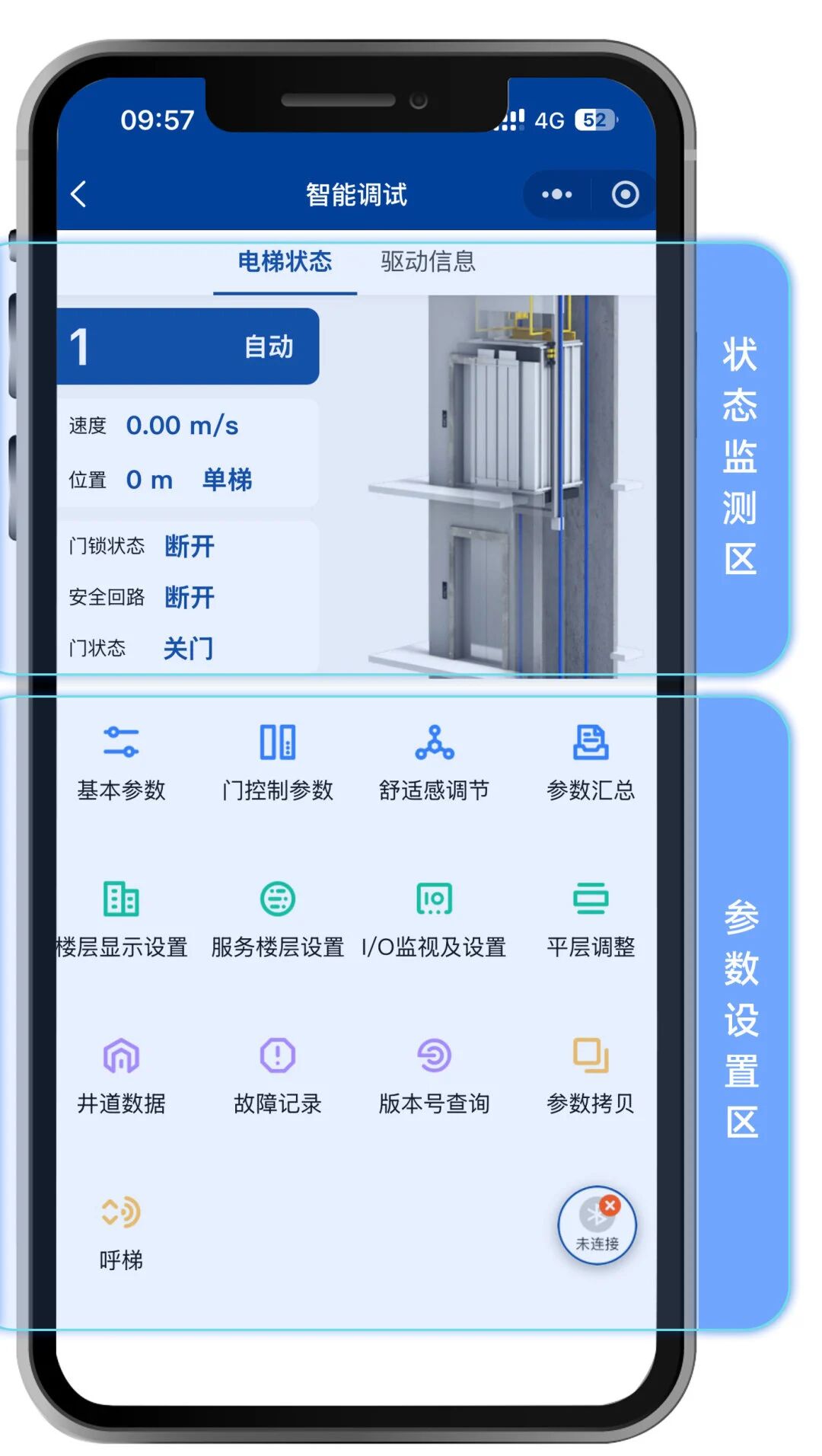 智能调试最大的创新点就是采用了分屏显示。页面的上半部分是状态监测区,下半部分则是参数设置区,调试设置与实时监测两不误!