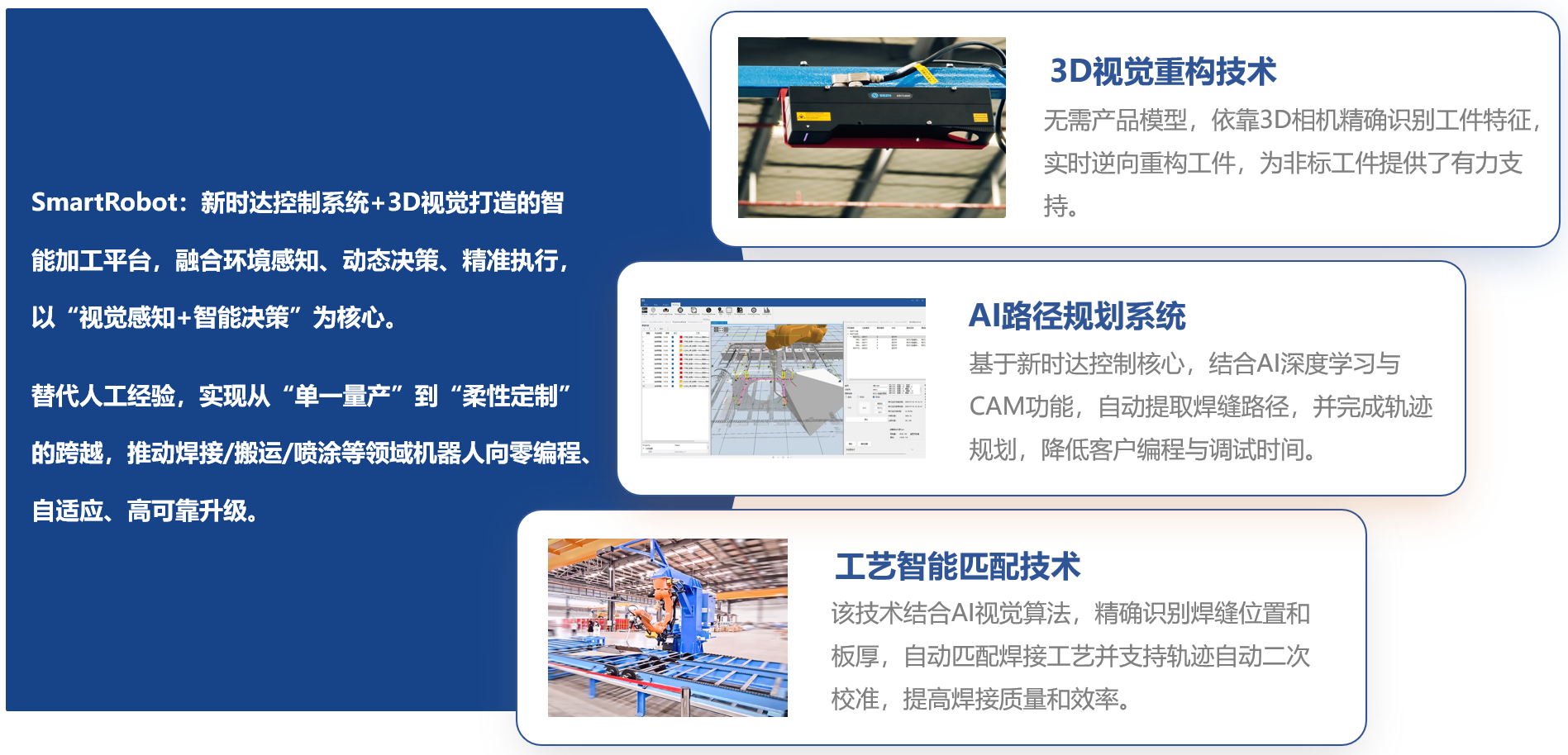 当前焊接行业面临人工依赖度高、环境适应性差、质量稳定性不足、高端材料焊接难等核心痛点,尤其在船舶、钢构、工程机械等领域,多品种、小批量的生产需求让传统焊接机器人难以适配。新时达紧扣行业需求,以“机器人+AI”为核心战略,推出免示教智能焊接解决方案,从“经验驱动”迈向“数据驱动”,为柔性制造提供全新路径。