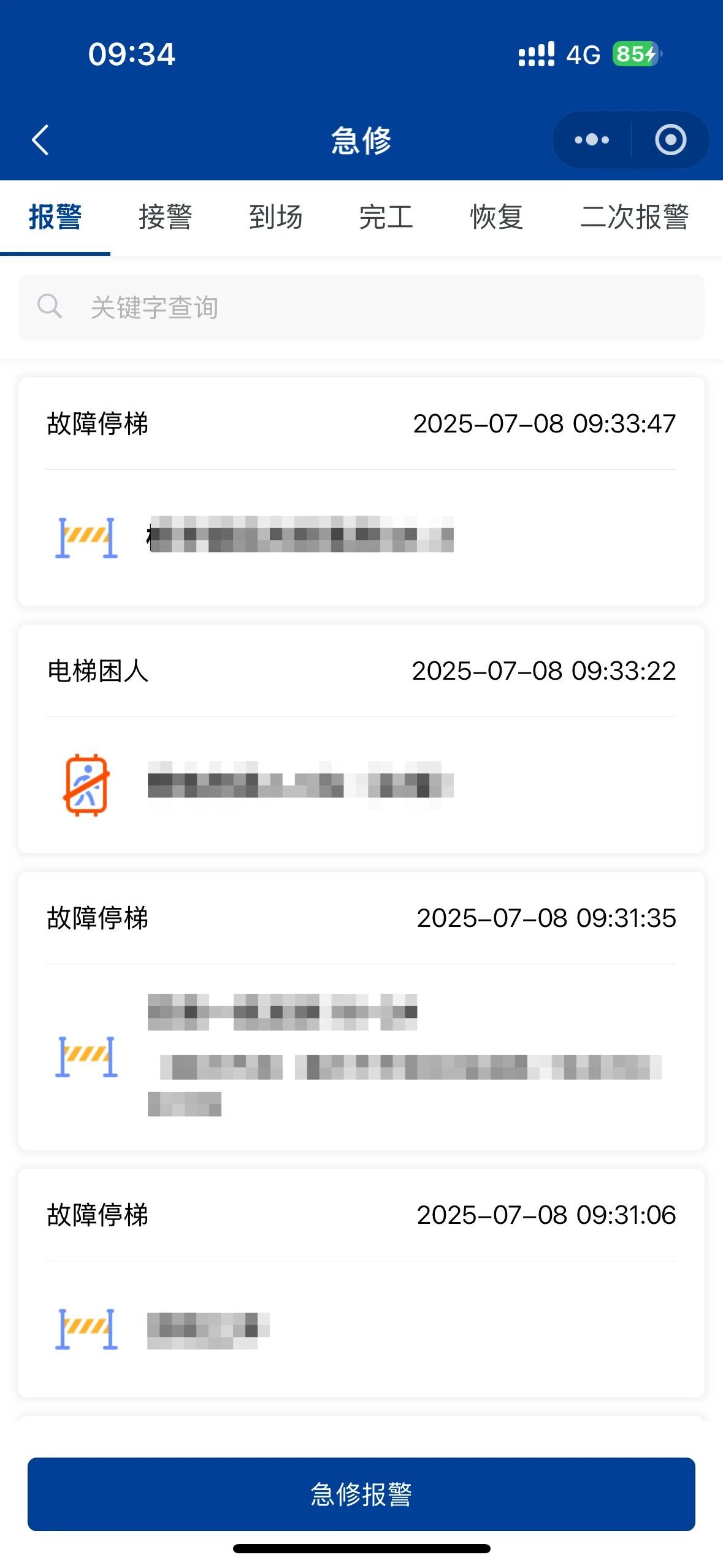 急修工单管理按报警、接警、到场、完工等状态分类,既支持系统自动报警,也接受人工上报,处理全流程有据可查。