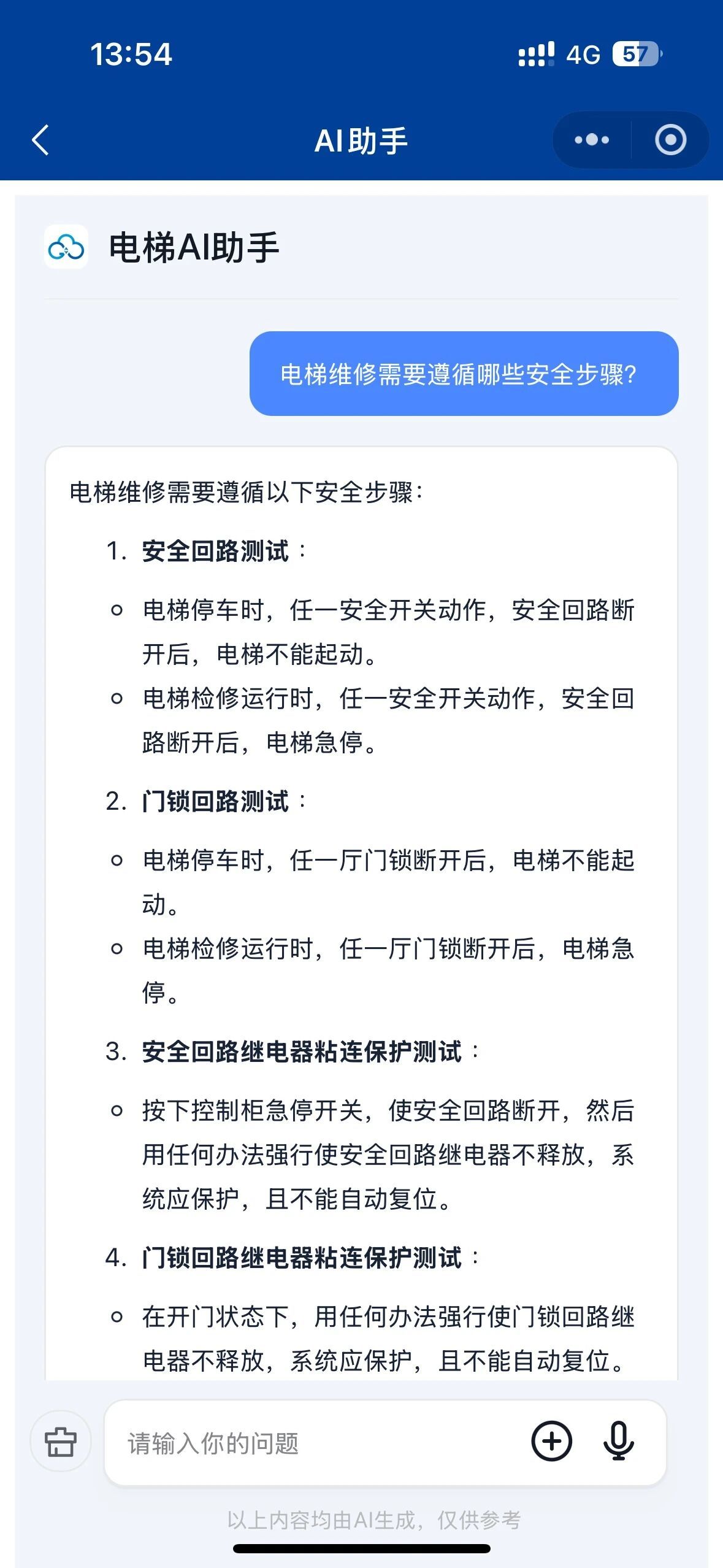 更值得一提的是 AI 助手,依托新时达独有的专家知识库,能解答电梯使用说明、故障解析、参数设定等各类问题,并支持复制、点赞及反馈功能。